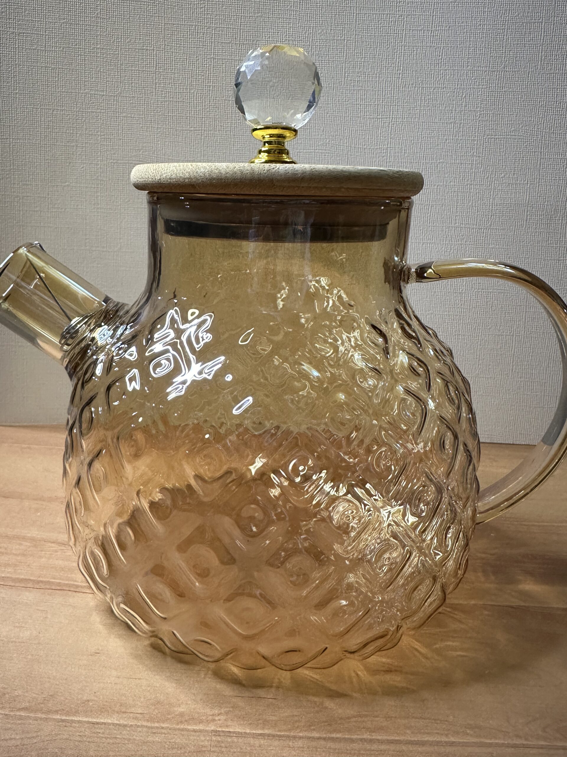 Tetera color ámbar de vidirio borosilicato tallado. Tapa hermética de bambú. Filtro desmontable de fácil limpieza.